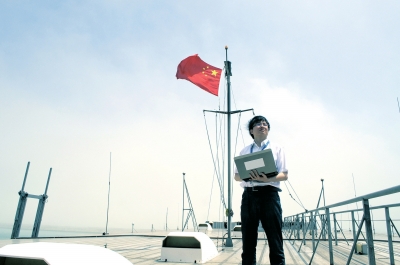 鄭任遠(yuǎn)在海峽號甲板上測試信號