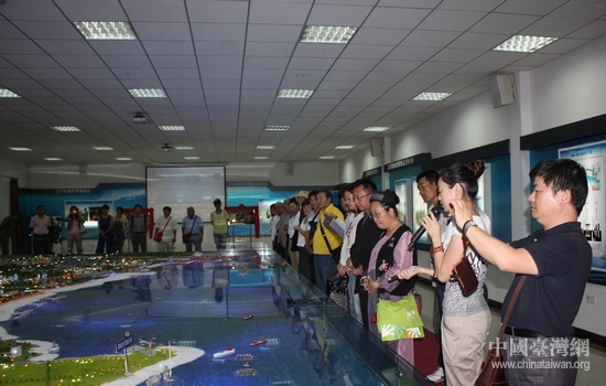 東戴河新區(qū)管委會(huì)工作人員就沙盤向臺(tái)灣客商介紹東戴河新區(qū)基本情況。(圖片來源:葫蘆島市臺(tái)辦)