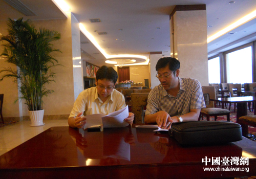 臺辦主任與臺灣省商業(yè)會副秘書長林元翔圍繞油頁巖項目洽談。(圖片來源:北票市臺辦)