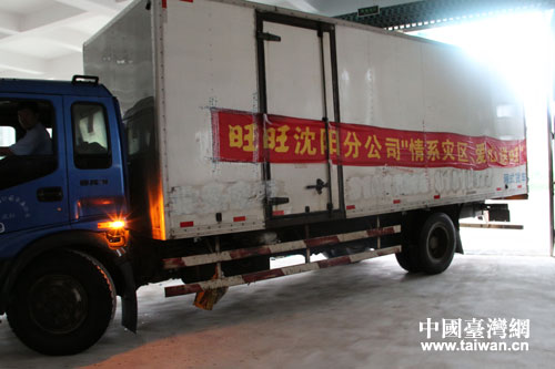 8月28日,臺灣旺旺集團(tuán)北京必旺食品有限公司沈陽分公司到慈善總會并通過他們向災(zāi)區(qū)捐獻(xiàn)了愛心捐物資。圖為車輛運輸物資。圖片來源:撫順臺辦