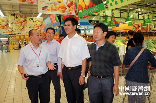 葫蘆島市政協(xié)副主席劉德興、市臺辦主任劉志新等一行在大潤發(fā)葫蘆島店總經(jīng)理谷宇宏的陪同下視察大潤發(fā)超市。(葫蘆島市臺辦供圖)