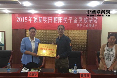 在獎(jiǎng)學(xué)金發(fā)放儀式上,克什克騰旗副旗長(zhǎng)項(xiàng)淑華向頂新公益基金會(huì)理事長(zhǎng)騰鴻年,贈(zèng)送了“捐資助學(xué)先進(jìn)集體”的牌匾(中國(guó)臺(tái)灣 蕪?fù)瑪z)