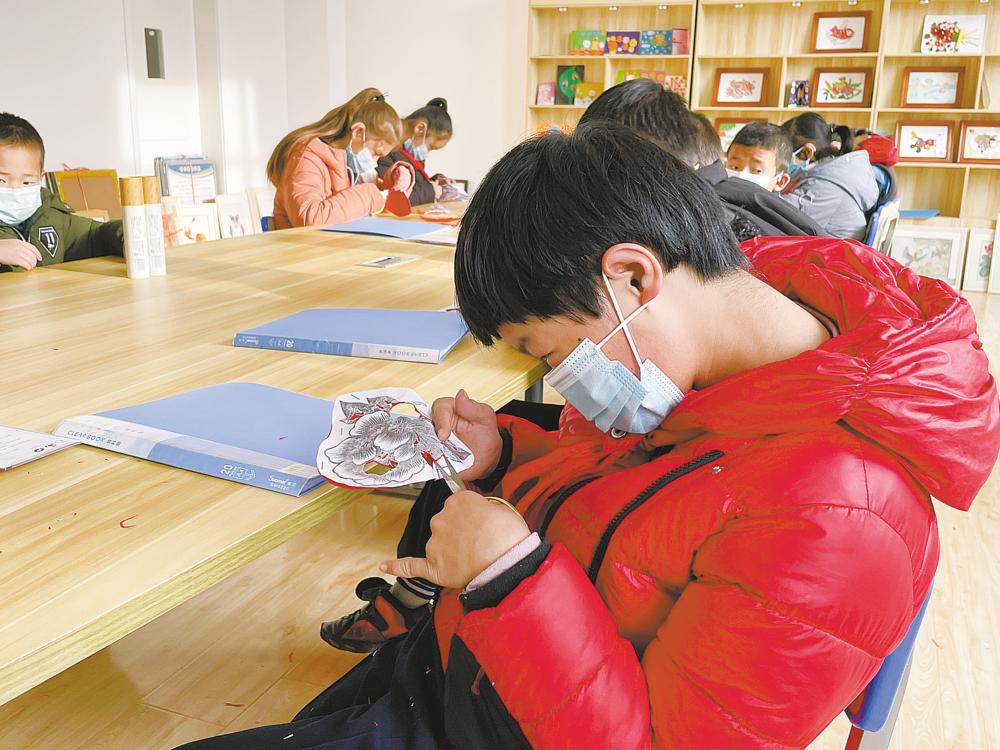 冬日里,午后的陽(yáng)光灑進(jìn)教室,在一圈圈的光暈下,孩子們正在老師的指導(dǎo)下學(xué)習(xí)剪紙,隨著形狀不一的紙屑飄落,手中上下翻飛的剪刀也停了下來(lái)。不一會(huì)兒,一個(gè)紅彤彤的“春”字就出現(xiàn)在孩子們手里。