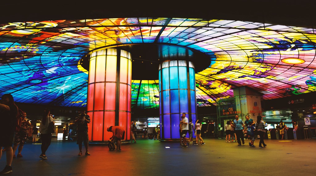 高雄不只有“駁二”,還有美麗島捷運(yùn)站,據(jù)說,這是來高雄最不能錯過的景點之一。美麗島捷運(yùn)站由日本后現(xiàn)代主義建筑師高松伸設(shè)計,這個號稱“世界第二美”的地鐵站,也已成為城市的藝術(shù)象征。地鐵站內(nèi),由意大利藝術(shù)家水仙大師親手打造的“光之穹頂”是主景點·,穹頂畫包含“水”、“土”、“光”、“火”四大區(qū)塊,傳遞人性的價值,闡釋人與人、環(huán)境、及萬物之間的關(guān)系。穹頂?shù)墓馍r明,圖像形態(tài)各異,同樣也是迅速吸引參觀者的目光,形成強(qiáng)烈的視覺沖擊。從穹頂大廳走上地面,有四個玻璃帷幕的出口,而這四個出口的設(shè)計,恰如合掌姿態(tài),蘊(yùn)含“祈禱民生和平”的概念。