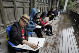 圖 :參加體驗(yàn)式交流活動(dòng)魯臺(tái)大學(xué)生在濟(jì)南大學(xué)和棗莊臺(tái)兒莊,并一起寫(xiě)生創(chuàng)作