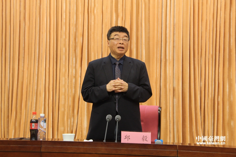 臺(tái)灣著名學(xué)者、臺(tái)灣中國文化大學(xué)國際企業(yè)管理研究所教授邱毅作專題報(bào)告(圖片來源:山東省臺(tái)港澳辦)
