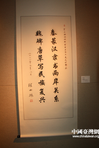 海協(xié)會會長陳云林書法作品“秦篆漢隸書兩岸關(guān)系 魏碑唐草寫民族復興” (中國臺灣網(wǎng) 李桂英 攝)