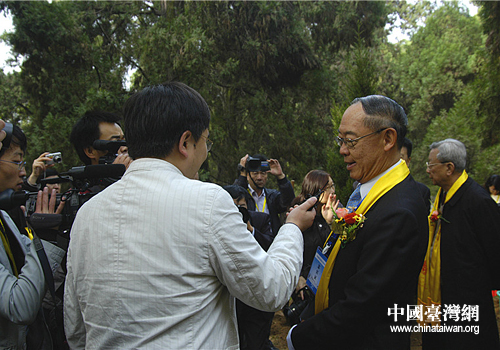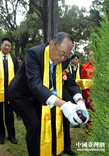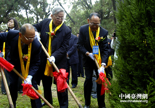錢復(fù)先生將阿里山的土、日月潭的水灑在栽植的“同根同源”紀念樹下。(圖片來源:陜西省臺辦)