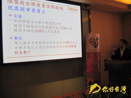 如何確保赴臺(tái)游的品質(zhì)?臺(tái)旅會(huì)北京辦事處主任楊瑞宗在座談會(huì)上首推赴臺(tái)游優(yōu)質(zhì)行程。所謂優(yōu)質(zhì)團(tuán)的標(biāo)準(zhǔn),臺(tái)旅會(huì)將從行程、交通、住宿、餐廳、購(gòu)物等5個(gè)面向訂出相關(guān)規(guī)定,作為未來(lái)審核之標(biāo)準(zhǔn),包括旅游團(tuán)每天行程不得超過(guò)12小時(shí)、所搭乘游覽車大巴行駛里程不得超過(guò)250公里,且要提供裝有GPS行車紀(jì)錄器之大巴租車契約、午晚餐合計(jì)餐標(biāo)需達(dá)500元臺(tái)幣以上、全程三分之一天數(shù)須入住星級(jí)旅館、且全程無(wú)安排特定購(gòu)物商店,或購(gòu)物商店總數(shù)不超過(guò)全程總夜數(shù)、高單價(jià)購(gòu)物行程只能安排一站,若走環(huán)島行程,花東可再加一站購(gòu)物店。