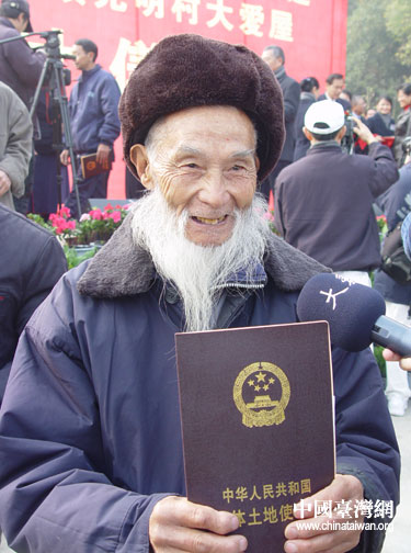 84歲肖天劍老人拿到房屋土地使用證。圖片來源:德陽市臺(tái)辦