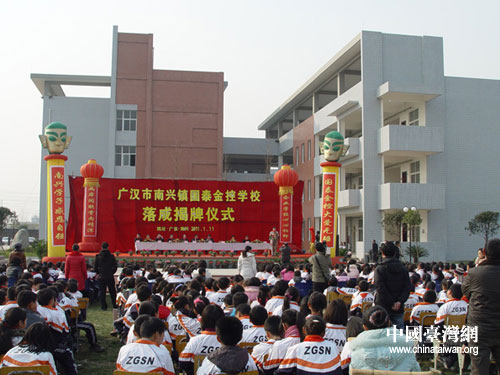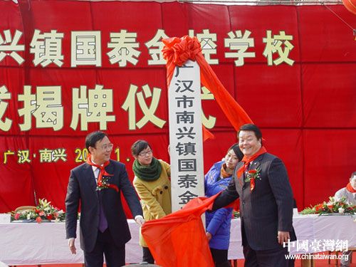 中國(guó)臺(tái)灣網(wǎng)1月13日德陽(yáng)消息 日前,在新落成的廣漢市南興鎮(zhèn)國(guó)泰金控學(xué)校內(nèi),鑼鼓喧天,彩旗飄飄,由臺(tái)灣國(guó)泰人壽慈善基金會(huì)捐資1300萬(wàn)元人民幣援建的廣漢市南興鎮(zhèn)國(guó)泰金控學(xué)校落成揭牌儀式在這里舉行。