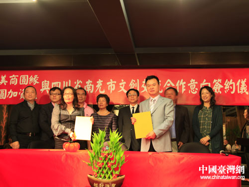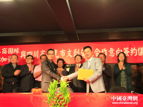 南充市文化創(chuàng)意訪問團(tuán)與臺灣“美商圓緣文化創(chuàng)意公司”簽約。圖片來源:南充市臺辦