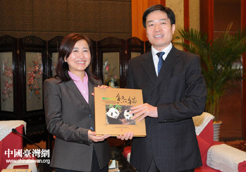 四川副省長甘霖向臺(tái)灣參訪團(tuán)贈(zèng)送大熊貓郵冊。(圖片來源:四川省臺(tái)辦)