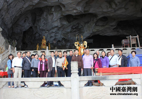 陳福林一行與臺(tái)灣游客在乾元山金光洞前合影留念。(圖片來源:綿陽市臺(tái)辦)