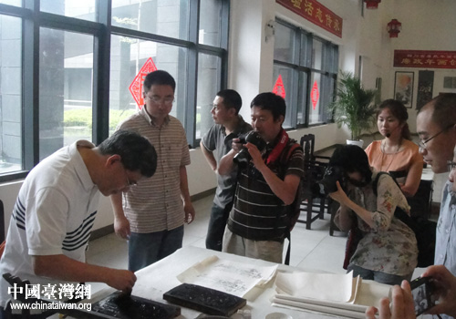 臺灣“中國時(shí)報(bào)”副總編輯黃樹德體驗(yàn)綿竹年畫上墨印線技法。(圖片來源:德陽市臺辦)