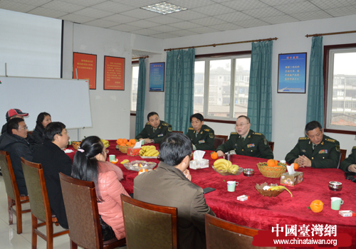 中國臺灣網1月16日瀘州消息 1月16日,瀘州市委臺辦主任韓俊平、市委研究室主任史乃廣、市婦聯(lián)主席陳孝冰一行帶著慰問品看望慰問了駐瀘某軍代室官兵,向官兵們送上新年的祝福。同時,三個部門負責人向軍代室通報了2012年各部門工作情況,軍代室首長也向慰問團一行作了國防形勢宣教。(中國臺灣網瀘州市委臺辦通訊員 周貞勇)