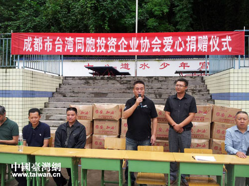 中國(guó)臺(tái)灣網(wǎng)9月4日成都消息 9月2日,成都市臺(tái)灣同胞投資企業(yè)協(xié)會(huì)常務(wù)副會(huì)長(zhǎng)唐中柱一行前往雅安蘆山地震災(zāi)區(qū),在天全縣仁義初級(jí)中學(xué)舉行了成都市臺(tái)灣同胞投資企業(yè)協(xié)會(huì)愛心捐贈(zèng)儀式,向在“4.20”地震中受災(zāi)的仁義中學(xué)捐贈(zèng)物資。雅安市臺(tái)辦副主任時(shí)勇等陪同前往。