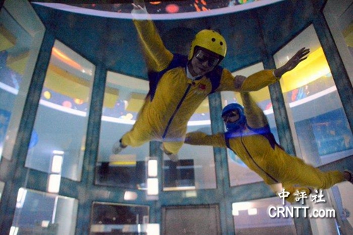 穿上“中國航天”服裝、戴上護目鏡的范穎微和蘭忠偉,在教練指導(dǎo)下,在氣流轉(zhuǎn)速達到50米/秒的飛行艙中,立馬擺脫地心引力“飛”了起來。