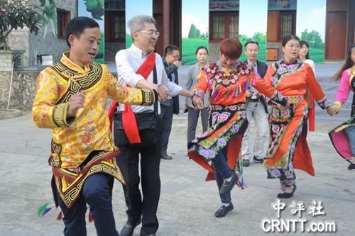 臺灣中評通訊社社長俞雨霖與寨中居民跳羌族傳統(tǒng)舞蹈。(中評社 戴祺修攝)