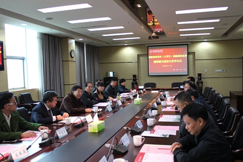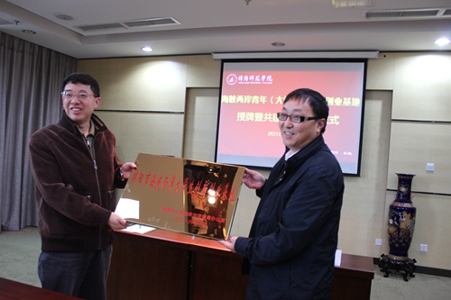 綿陽市臺辦向綿陽師范學院授牌“綿陽市海峽兩岸大學生創(chuàng)新創(chuàng)業(yè)基地”儀式在綿陽師范學院舉行。(左為綿陽臺辦主任陳福林、右為綿陽師范學院院長王海濱)