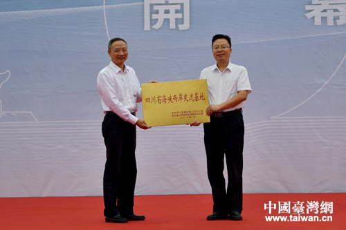 四川省臺辦主任周敏謙(左)為李莊鎮(zhèn)授牌