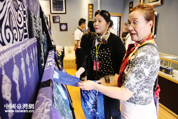 參訪團(tuán)成員仔細(xì)端詳苗族蠟染。(圖片來(lái)源:宜賓市臺(tái)辦)