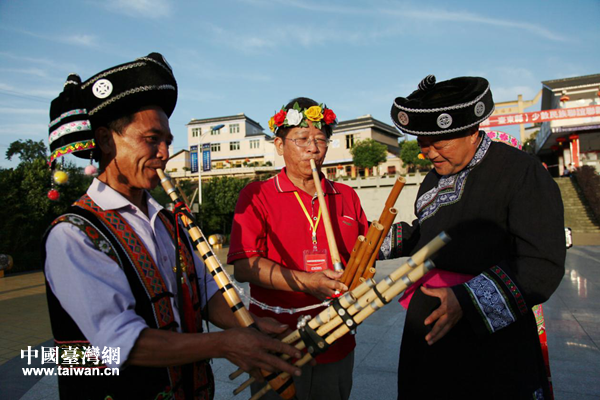 參訪團(tuán)成員在苗族樂(lè)手指導(dǎo)下,學(xué)習(xí)吹奏蘆笙。(圖片來(lái)源:宜賓市臺(tái)辦)