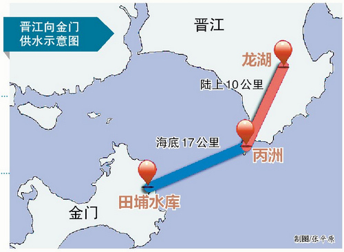 福建向金門供水工程水源取自泉州市晉江流域,由晉江金雞攔河閘引水至?xí)x江市龍湖水庫,經(jīng)龍湖抽水泵站抽水輸水至圍頭入海點(diǎn),再經(jīng)海底管道輸送至金門,輸水線路總長27.56公里,其中福建方面陸地管道11.6公里、海底管道15.76公里,金門方面陸地管道0.2公里,工程總投資3.878億元。福建方面負(fù)責(zé)龍湖取水泵站、龍湖水庫至丙洲入海點(diǎn)的供水設(shè)施建設(shè),金門方面負(fù)責(zé)從丙洲入海點(diǎn)至田埔水庫的購水設(shè)施建設(shè),即海底管線由金門方全段出資、建設(shè)和營運(yùn)。工程設(shè)計(jì)日供水規(guī)模3.4萬立方米,通水后,福建將按計(jì)劃每天24小時(shí)連續(xù)供水。目前,大陸段已完成投資1.1億元,占大陸段工程總投資的87.8%。