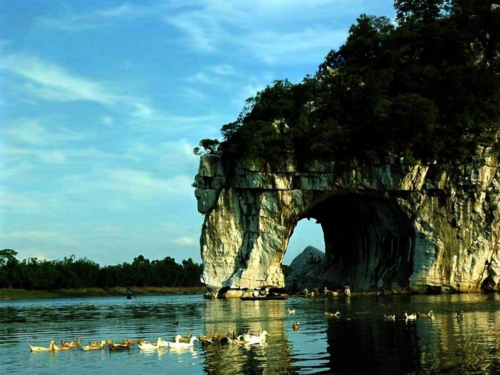 象鼻山位于桂林市內(nèi)桃花江與漓江匯流處, 是桂林名山之一;主要景點(diǎn)有水月洞、象眼巖、普賢塔、宏峰寺及寺內(nèi)的太平天國(guó)革命遺址陳列館等。在桃花江與漓江匯流處,西距文昌橋200米。海拔200米,高出江面55米,長(zhǎng)108米,寬100米,山體面積1.3公頃。由3.6億年前海底沉積的純石灰?guī)r組成,酷似一頭巨象伸長(zhǎng)鼻子吸飲江水。象鼻山原名漓山,又名宜山、儀山、沉水山,簡(jiǎn)稱象山。象山以神奇著稱。其神奇,首先是形神畢似,其次是在鼻腿之間造就一輪臨水皓月,構(gòu)成“象山水月”奇景。因此,象山成了桂林山水的代表、桂林城的象征,桂林乃至廣西地方產(chǎn)品多以象山作為標(biāo)記。