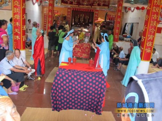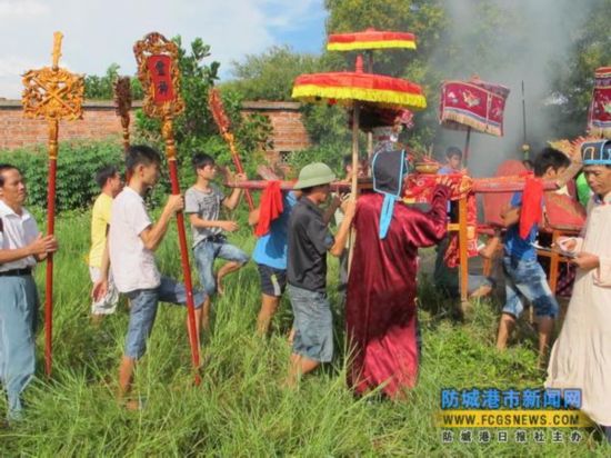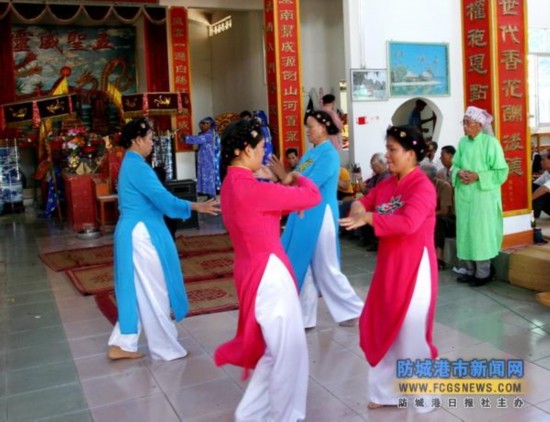 哈節(jié)除了歌舞娛樂(lè)外,還依順序舉行“迎神”、“祭神”、“送神”等儀式。“迎神”的人們打著羅傘,抬著神案,于鼓樂(lè)聲中到大海邊把“鎮(zhèn)海大王”等靈神迎接回哈亭正殿就座,然后由德高望重的人主持,率眾人以“三牲五禮”敬獻(xiàn)于諸神及歷代先祖面前,祈求他們保護(hù)全村平安,各戶興旺。直到哈節(jié)結(jié)束,才再次打傘抬案,一路香燭相伴,把諸神送歸天界。京族人的宗教觀念大都與海有關(guān),寄托著他們對(duì)大海的敬畏及追求。(盧欣)