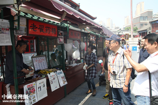 兩岸媒體人參訪民俗文化街,被天津傳統(tǒng)風(fēng)味小吃老翟藥糖吸引駐足。(中國(guó)臺(tái)灣網(wǎng) 陳科炎 攝)