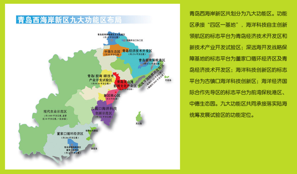 2014年6月3日,經(jīng)國務(wù)院批復(fù)設(shè)立,是全國第九個國家級新區(qū)。新區(qū)位于東經(jīng)120°,北緯36°,地處膠州灣西岸,包括青島市黃島區(qū)全部行政區(qū)域,其中陸域面積2096平方公里,海域面積約5000平方公里,海岸線282公里;沿海分布23處港灣、21座島嶼,灘涂面積83平方公里;共有27個街鎮(zhèn),常住…… 【詳情】