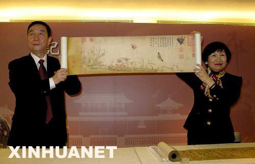 3月2日,鄭欣淼(左)與周功鑫共同展示故宮博物院贈送的宋朝趙昌的《寫生蛺蝶圖》復(fù)制品。