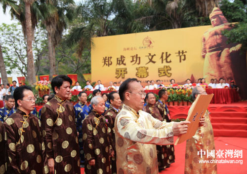 5月17日,來自海峽兩岸的民眾在廈門思明區(qū)鼓浪嶼舉行盛大頌典,共祭民族英雄鄭成功。由此,正式拉開了“鄭成功文化節(jié)”的大幕。圖為主祭人念祭文。(中國臺灣網(wǎng) 邵磌 攝)
