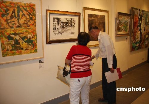 圖為臺灣藝術(shù)愛好者在欣賞“海峽兩岸繪畫聯(lián)展”。 中新社發(fā) 耿軍 攝