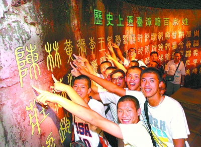 “根在海這邊”——參觀閩臺族譜對接館,臺灣學生在歷史上遷臺漳籍百家姓上找到了自己的姓氏。(記者 祝敏松 攝)。