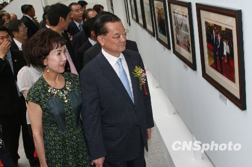 資料圖:2009年7月29日下午,胸懷山河歲月,戀戀兩岸情濃——臺灣攝影師楊永山先生攝影展在天津開幕。正在天津參訪的中國國民黨榮譽主席連戰(zhàn)出席影展開幕式并致辭。圖為連戰(zhàn)夫婦參觀臺灣攝影師楊永山先生攝影展。 中新社發(fā) 郭曉帆 攝