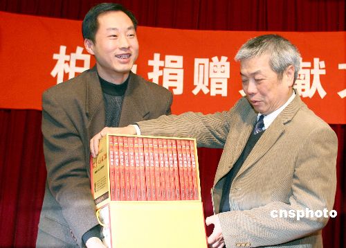 資料圖:2007年2月6日,“柏楊捐贈(zèng)文獻(xiàn)文物入藏新聞發(fā)布會(huì)”在北京中國(guó)現(xiàn)代文學(xué)館舉行,中國(guó)現(xiàn)代文學(xué)館館長(zhǎng)陳建功(右)代表文學(xué)館現(xiàn)場(chǎng)接受了捐贈(zèng)的《柏楊版資治通鑒》。 中新社發(fā) 廖文靜 攝