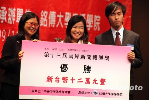 11月4日,由臺(tái)灣中華發(fā)展基金會(huì)主辦的第十三屆兩岸新聞報(bào)道獎(jiǎng)在臺(tái)北舉行頒獎(jiǎng)典禮,臺(tái)灣“陸委會(huì)”主委賴幸媛為獲得電視新聞報(bào)道獎(jiǎng)的客家電視臺(tái)記者林秋伶、徐榮俊頒獎(jiǎng)。今年評(píng)選活動(dòng)共有十類、二十八件新聞作品入圍,分別從傳播、新聞、政法、經(jīng)濟(jì)及兩岸關(guān)系等多方面、多角度地進(jìn)行了深入報(bào)道,呈現(xiàn)出全面展開且更為深入的良性趨勢。承辦方、銘傳大學(xué)傳播學(xué)院院長陳耀竹表示,希望藉由該活動(dòng)讓兩岸互相了解傳播現(xiàn)狀,減少認(rèn)知上的差異。中新社發(fā) 李佳佳 攝