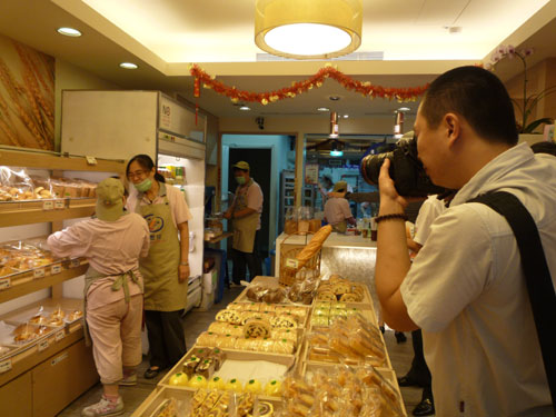 采訪臺(tái)北市喜憨兒社會(huì)福利采訪團(tuán)的記者在采訪心智障礙者訓(xùn)練場(chǎng)面包烘培房