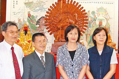臺灣關(guān)公文化節(jié)人文藝術(shù)展27日將在桃園縣府與文化局同時展出,圖后方的木雕名為“千百億化身”,集合海峽兩岸10多位名師雕刻,有108只手,各執(zhí)法器與兵器。 圖片來源:臺灣《中國時報》