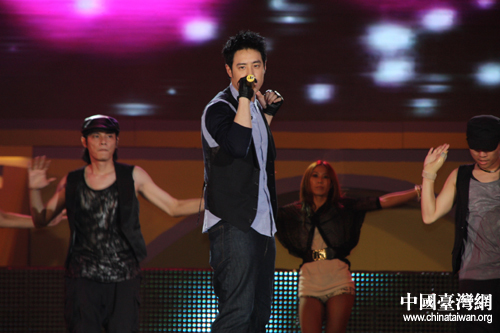 來(lái)自臺(tái)灣的偶像歌手潘瑋柏正在獻(xiàn)唱《壁虎漫步》、《快樂(lè)崇拜》等動(dòng)感音樂(lè)。(中國(guó)臺(tái)灣網(wǎng) 肖燕 攝)
