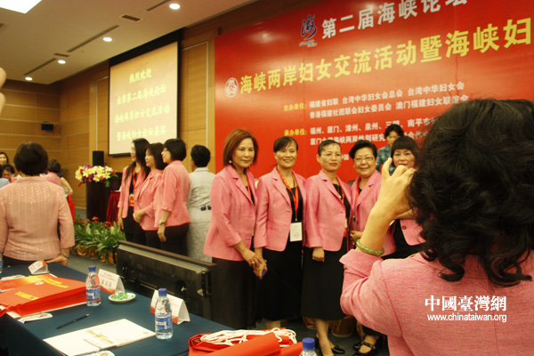 兩岸婦女代表們?cè)诖髸?huì)背景板前選取各種角度合影留念。(中國(guó)臺(tái)灣網(wǎng) 李桂英 攝)