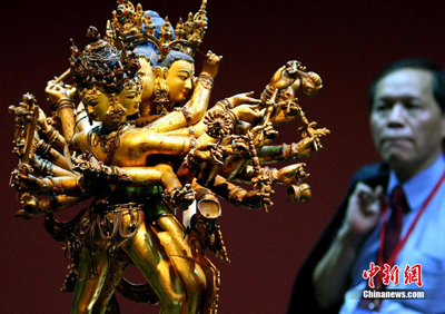 “圣地西藏---最接近天空的寶藏”特展,6月30日在臺(tái)灣故宮博物院揭開(kāi)面紗。這次展覽是臺(tái)灣歷年來(lái)規(guī)格最高、面向最完整的西藏文化與文物展,展出的130組件文物,來(lái)自西藏布達(dá)拉宮、羅布林卡等寺廟、西藏博物館、承德避暑山莊和北京民族文化宮等12處文物重鎮(zhèn)。整個(gè)展覽按“吐蕃王朝”、“金色寶藏”、“文化交流”、“雪域風(fēng)情”四部分布局展出,展覽9月19日結(jié)束。中新社記者 宋吉河攝