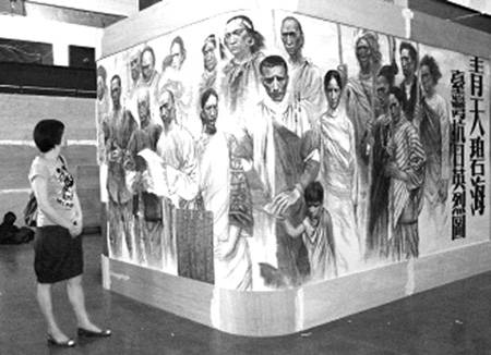 由50位大陸畫家花了5年半時(shí)間集體創(chuàng)作的一幅畫卷7月7日在臺(tái)北“國父紀(jì)念館”開幕,吸引了各界人士前去參觀。這幅長達(dá)800米的史詩國畫按真人比例繪出了1000多位抗戰(zhàn)歷史人物,其中包括210位殉職的國民黨將領(lǐng),以及羅福星、蔣渭水、丘逢甲、莫那魯?shù)赖葝u內(nèi)的抗日英雄。