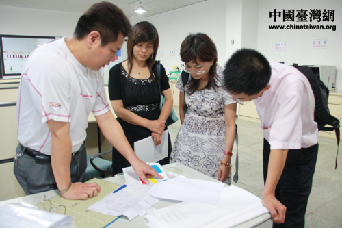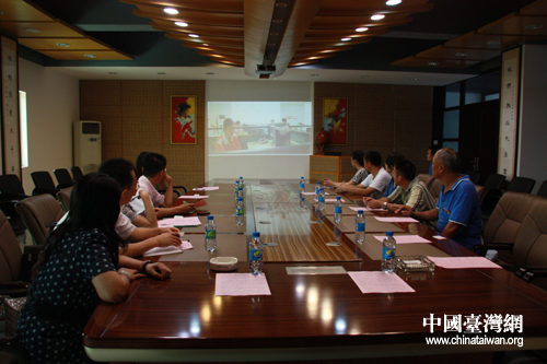 鵬程實(shí)業(yè)有限公司管理人員陪同臺(tái)企轉(zhuǎn)型升級(jí)服務(wù)團(tuán)及專家觀看企業(yè)宣傳片。(中國(guó)臺(tái)灣網(wǎng) 胡珊珊 攝)