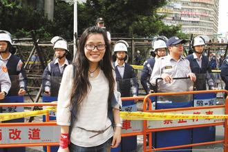 到了臺灣,街頭民主一定要見習一下的啦!抗議的紅色布條在右手綁成手環(huán),來自南京的黃艷梅,美美地跟臺灣警察合影留念一下吧。陳柏亨攝影