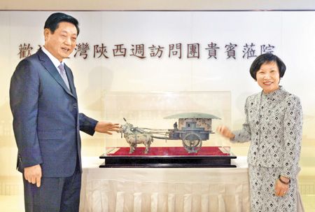 陜西省代省長趙正永(左)一行人15日在臺北故宮博物院院長周功鑫(右)陪同下參觀臺北故宮,趙正永贈送周功鑫“西安秦始皇陵二號銅車馬”4分之1比例復制品!碓矗号_灣《中國時報》
