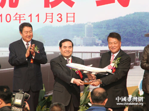 臺(tái)灣中華航空公司總經(jīng)理孫洪祥向青島市副市長(zhǎng)王廣正贈(zèng)送飛機(jī)模型。(韓軍 攝)