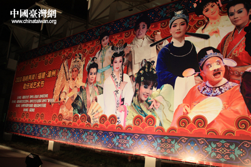 臺(tái)灣明華園黃字劇團(tuán)與漳州市薌劇團(tuán)同臺(tái)獻(xiàn)演大型歌仔戲《周公法斗桃花女》,圖為活動(dòng)現(xiàn)場(chǎng)宣傳展板。(中國(guó)臺(tái)灣網(wǎng) 胡珊珊 攝影)